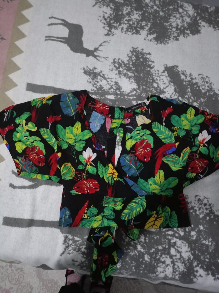 Çiçek desenli, kısa kollu, V yaka üst. aşırı canlı kaliteli renge ve kumaşa sahiptir hiçbir kusuru yok sadece bana küçük geldıgı ıcın satıyorum.