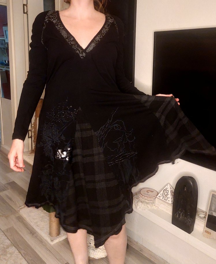 V yakalı ve uzun kollu, dökümlü ve bol kesim siyah uzun elbise. Nakışlı gotik desenlere sahip, romantik akşamlar için uygundur. M beden fakat geniş kalıptır, L bedene rahatlıkla olur, esnektir.