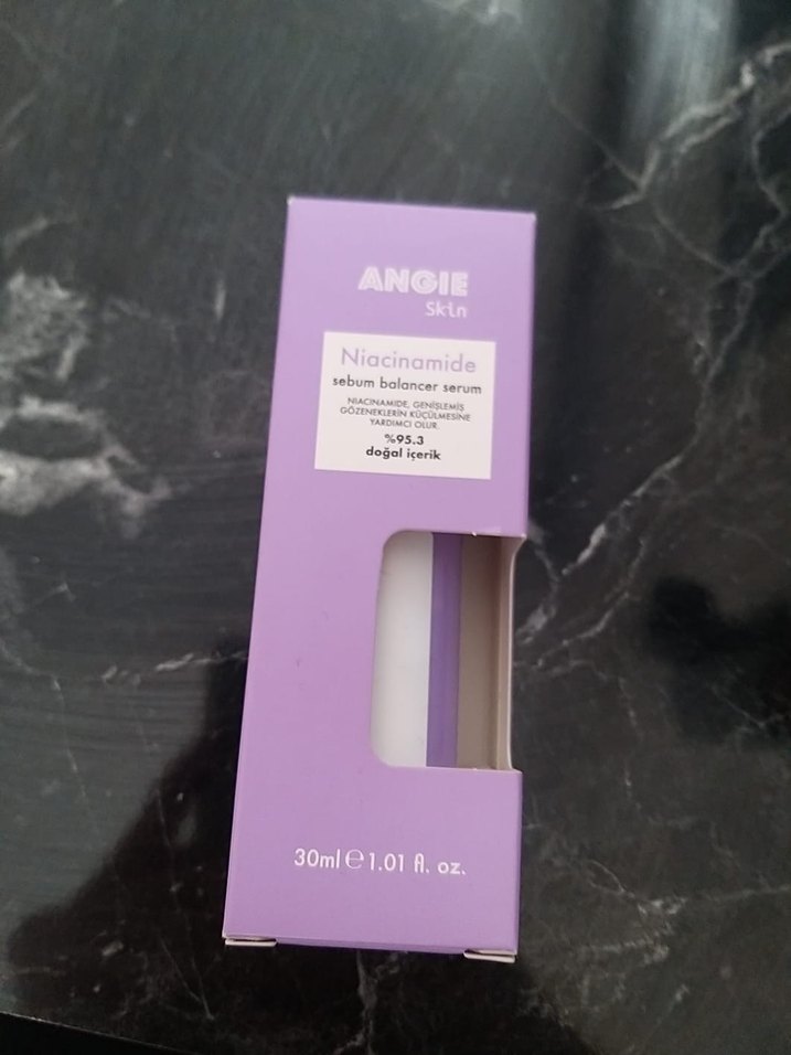 ANGIE markasına ait mor tonlarında pastel kutuda, cilt yağını dengelemeye yardımcı Niacinamide serum. 30ml içerir.
