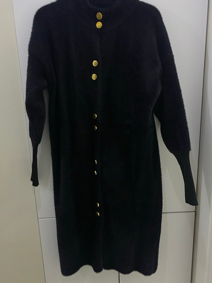 Angora Düğmeli Siyah Kadın Uzun Kaban