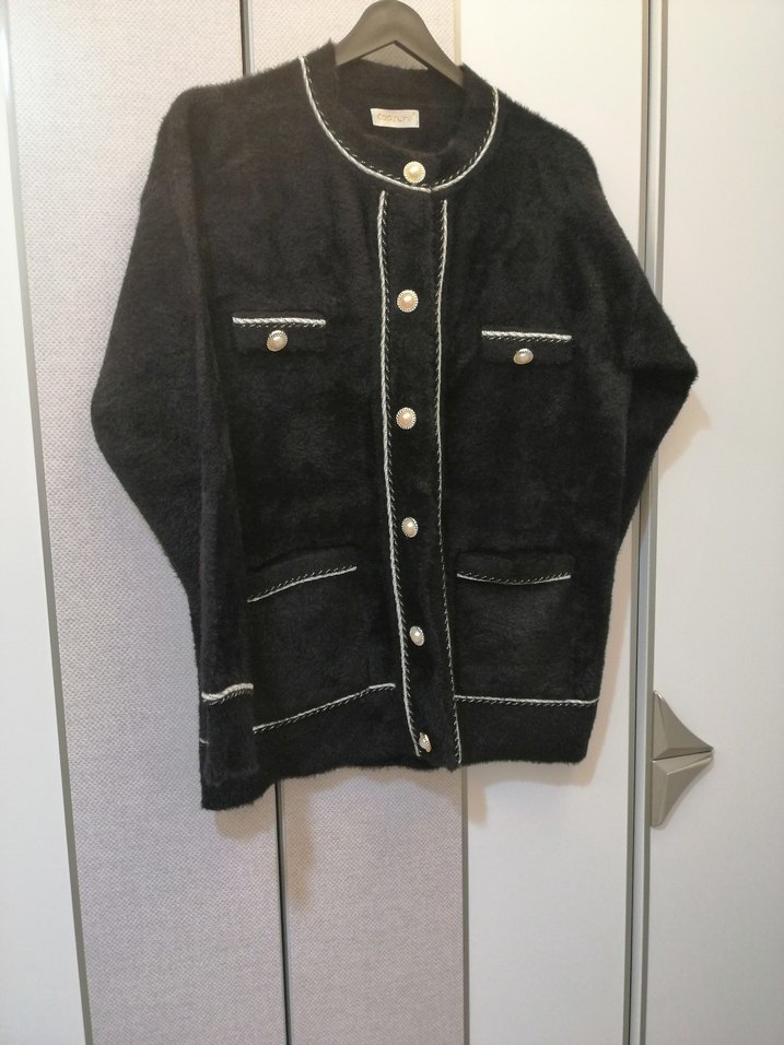 Angora hırka,düğmeli, uzun kollu siyah midi hırka, notlu yaka ve bol kesimdir. Desensiz, yumuşak dokulu kumaşı ve cep detaylarıyla günlük şıklık sağlar.Sadece bir kez kullanıldı