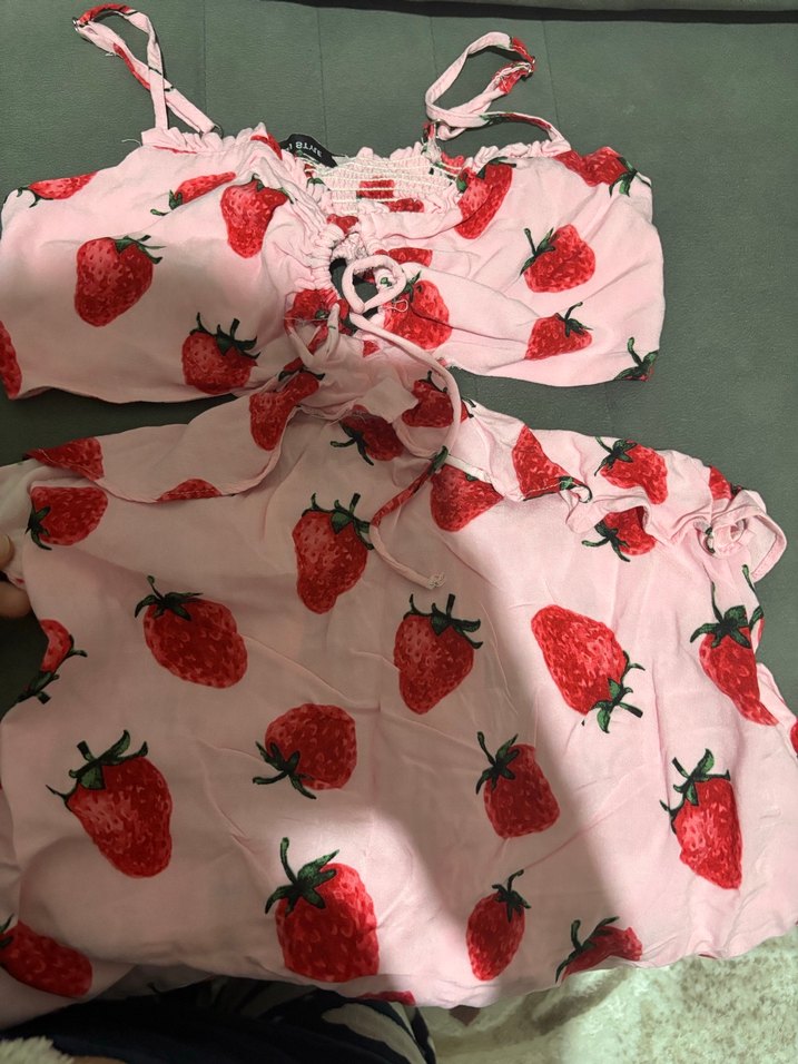 Pembe, çilek baskılı, ip askılı üst ve mini boy alt parçadan oluşan anime elbise. Hic kullanılmadı yanında sokuk var baska sorunu yok s m beden