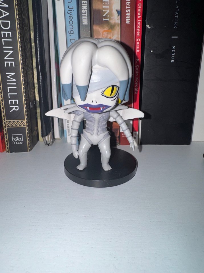 Gri renkli, kanatlı kollara ve büyük sarı gözlere sahip aksiyon figürü, siyah yuvarlak bir taban üzerinde duruyor.
