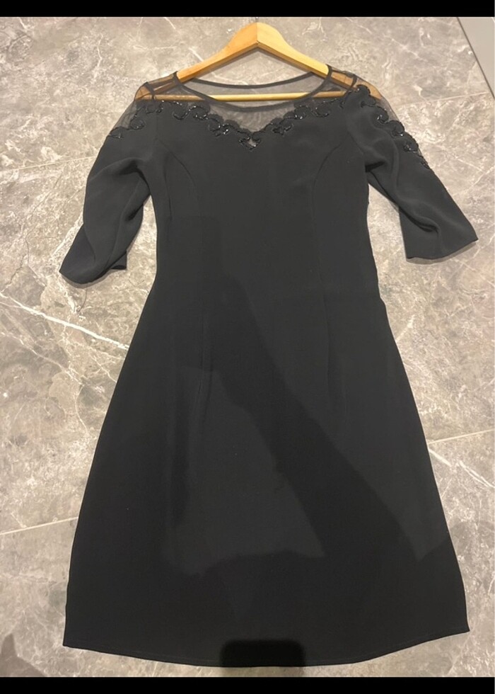 Bir kere giyilmiş şık yaka ve kollarının üst kısmı tül ve taş işlemeli şık elbise