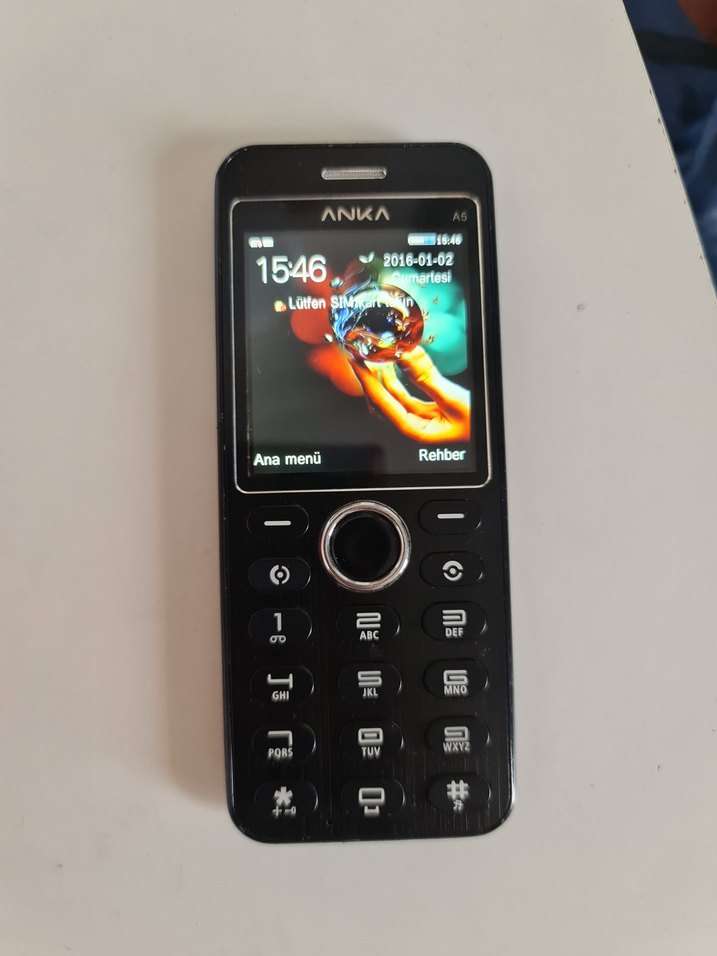 ANKA A6, siyah renkte, tuşlu ve kompakt tasarıma sahip bir telefondur. Tarih ve saat ekranı, ana menü ile rehber seçenekleri bulunur. . imei kapali.parca amacli