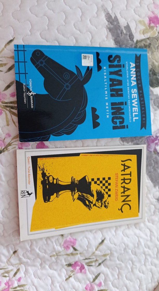 Mavi kapakta at resmi bulunan Anna Sewell'in Siyah İnci'si ve sarı kapakta satranç figürlerinin olduğu Satranç kitabı yer alıyor.