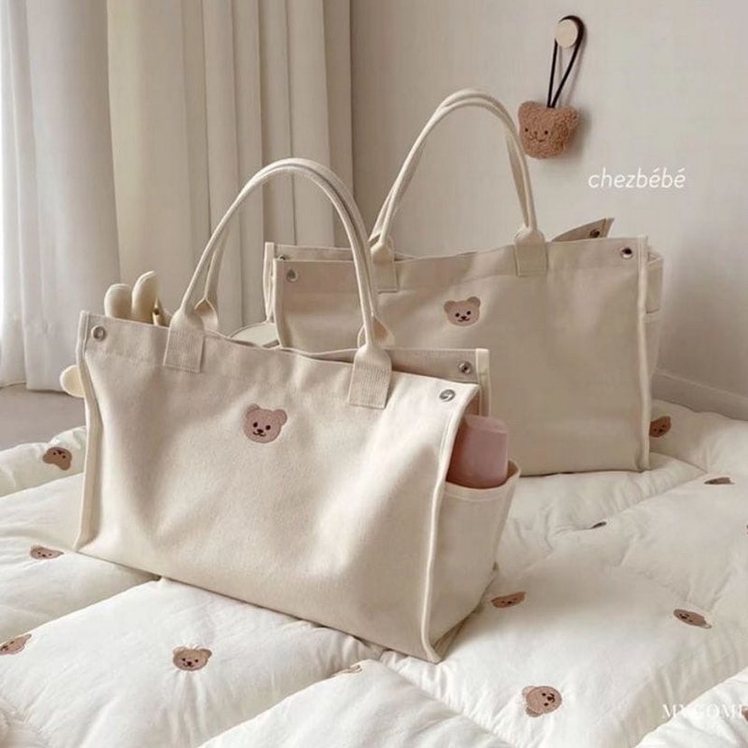 Bej canvas kumaştan, yan cepli ve ayı desenli minimalist çanta. Boyut 43x15x28 cm . Bebek arabası için uygun.