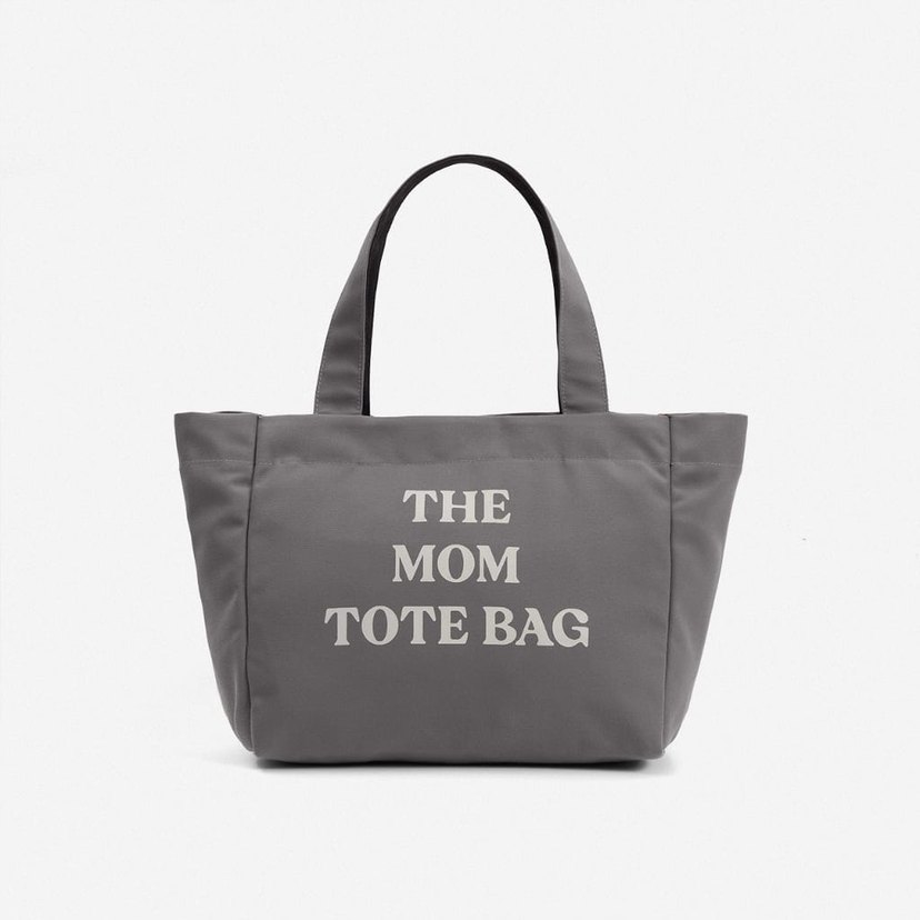 Koyu gri renkte, baskılı "THE MOM TOTEBAG" yazılı sentetik kumaş kadın tote çanta. Minimalist ve rahat tarzıyla günlük kullanıma uygundur. 46x29x15 cm. Yeni. Materyal thick canvas (kalın tuval)