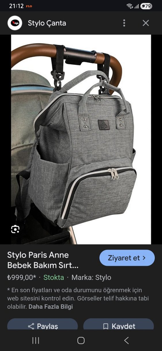 gri renkli bebek bakım sırt çantası, çok bölmeli ve sağlam kulplu, kolay taşınabilir. Pusetlere takılabilir. ici cok geniş ufak bir sökük var dikilebilir