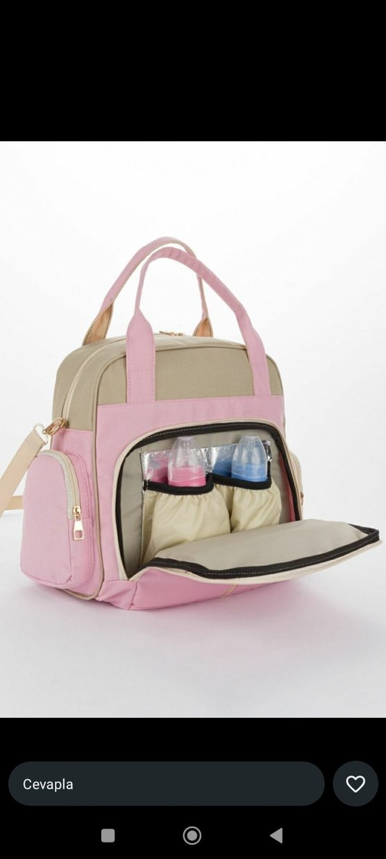 Pastel pembe renkte, çok bölmeli, yalıtımlı biberon tutucuları ve sap ile omuz askısı bulunan geniş bebek çantası.