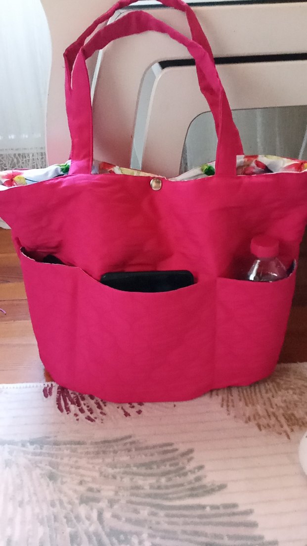 kapitone kumaştan yapılmış, çıtçıtlı, üç cep diş,içte 1 cep, fuşya daha soft aslında kadın çantası. Dış cepleri günlük kullanım için uygundur, bohem tarzına sahiptir. kendi dikimim