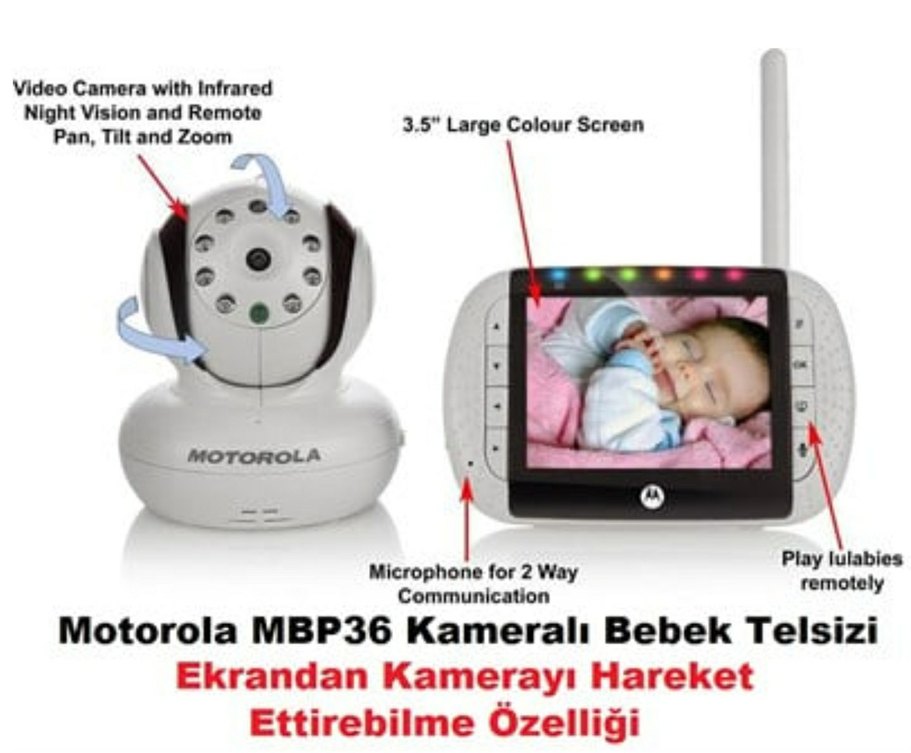 Ürün Önerileri Motorola MBP36 Kameralı Görüntülü Bebek Telsizi Ekrandan Kamerayı Hareket Ettirebilme Özelliği ÖZELLİKLER 3,5 inç / 9 cm renkli LCD Ekranı vardır.2,4 GHZ FHSS Kablosuz kullanabilme özelliğine sahiptir.Ebeveyn ünitesinden kamerayı yatak ve dikey hareket ettirebilme özelliği vardır. ECO modu bulunmaktadır. Düşük pil uyarı özelliği vardır.Menzil dışına çıkıldığında sizi uyarır.Hassas mikrofonu sayesinde en küçük seslere karşı duyarlıdır.Dijital yetkisiz erişimlere karşı son derece güvenlidir.Kızılötesi gece görüşü sayesinde kaliteli LCD ekranı sayesinde bebeğinizi net bir şekilde görebilirsiniz. Önceden kaydedilmiş 5 adet ninnisi ile bebeğinize huzurlu uyku ortamı sağlar. Oda sıcaklığını kontrol edebilmeniz için termometre özelliği bulunmaktadır. Otomatik kanal seçme özelliği ve otomatik gece görüşü özelliği bulunmaktadır. Uzaktan zoom özelliği bulunmaktadır. Kamerası duvara monte edilebilir. k4maera ile aynı anda çalışabilme özelliği vardır. (TAKAS OLUR