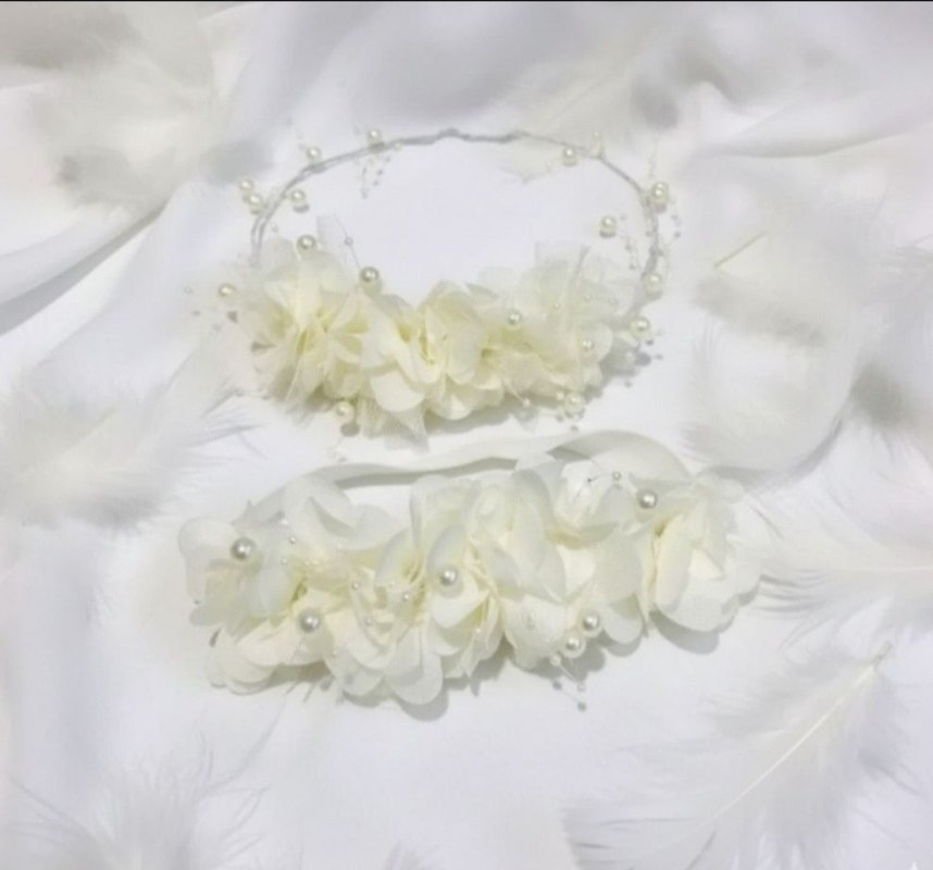 İnci detaylı lazer kesim çiçekli saç bandı. Lohusa seti. Krem renktedir. Herhangi bir deformesi bulunmuyor. 1 yaşa kadar uygundur.