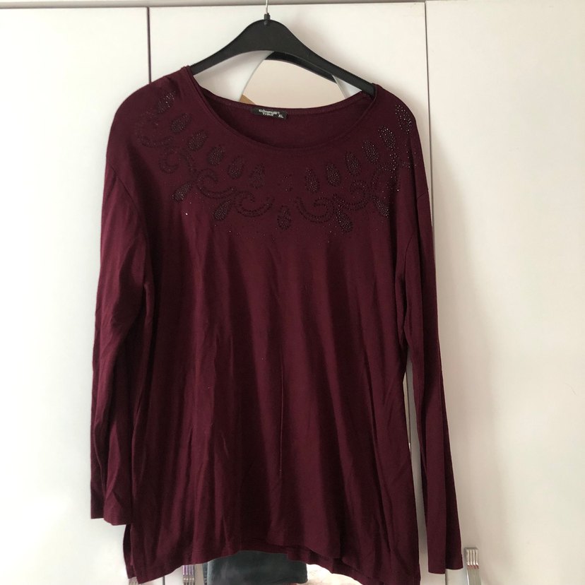 Bordo renkli, uzun kollu ve yuvarlak yakalı bluz. Salaş kesimi ve drape detaylarıyla günlük kullanıma uygundur. Yakada sade süslemeler bulunur.