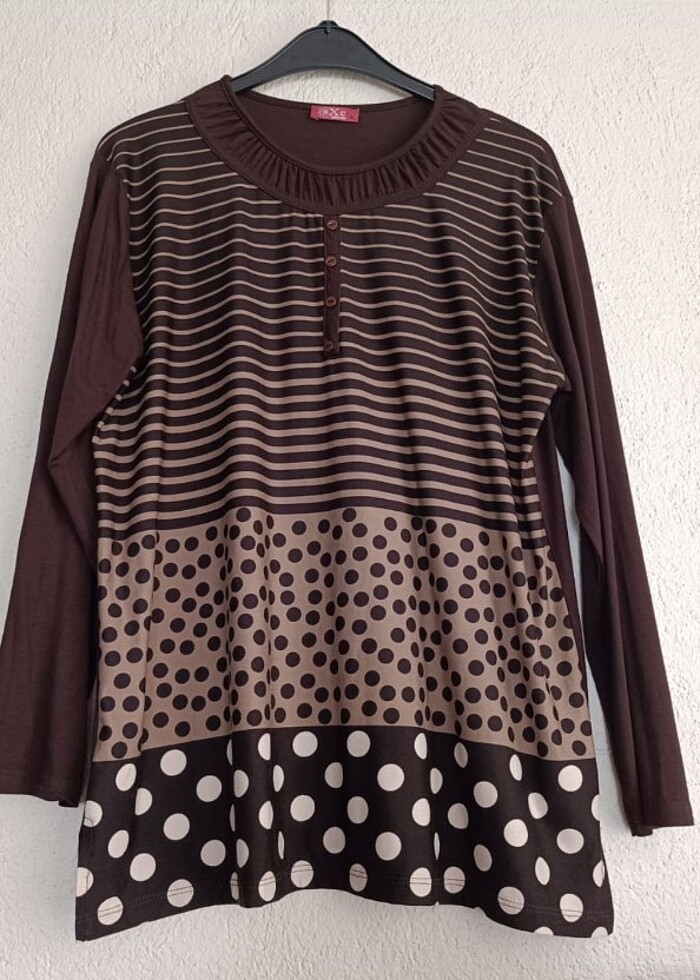 Az kullanılmış çekimden dolayı güneş lekesi varmış gibi duruyor kahverengi anne bluzu