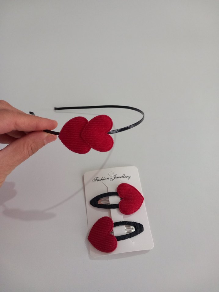 Kırmızı kadife kalp desenli taç ve iki saç tokasından oluşan, velcro ile kolayca tutturulabilen saç aksesuar seti. ❤️ Anne için taç çocuk için çıtçıt toka şeklinde hazırlanmıştır.