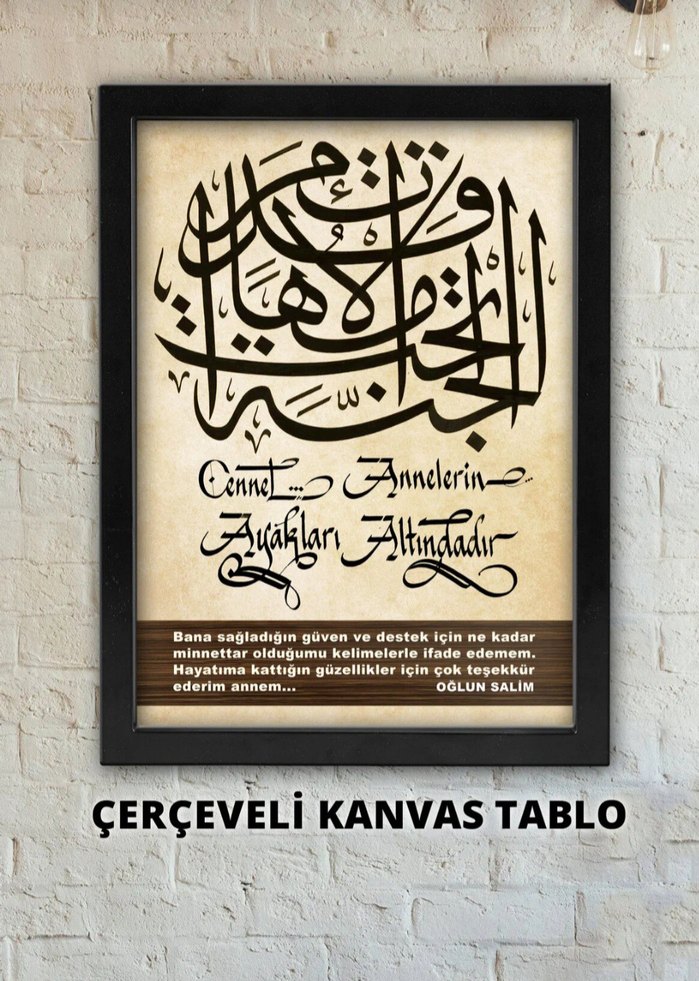 Cennet Annelerin Ayakları Altındadır yazılı Özel Tasarım kanvas Tablo.1.sınıf kanvas kumaş kullanılmıştır. Tasarımcı tarafından tasarlanmış ve üretilmiştir.Çerçevesi özel üretilmiştir.Birleştirme çerçeve değildir.Evleriniz ve ofisleriniz için harika bir tasarımdır.