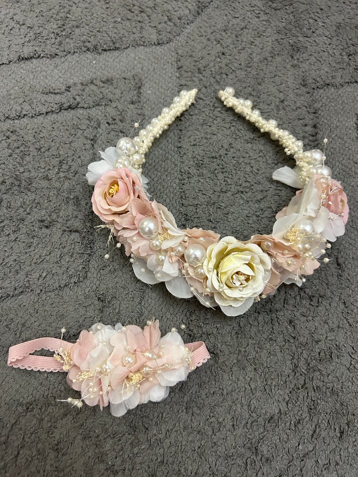Anne-Kız bebek lohusa tacı İşlemeli Pembe Vintage Saç Aksesuarı