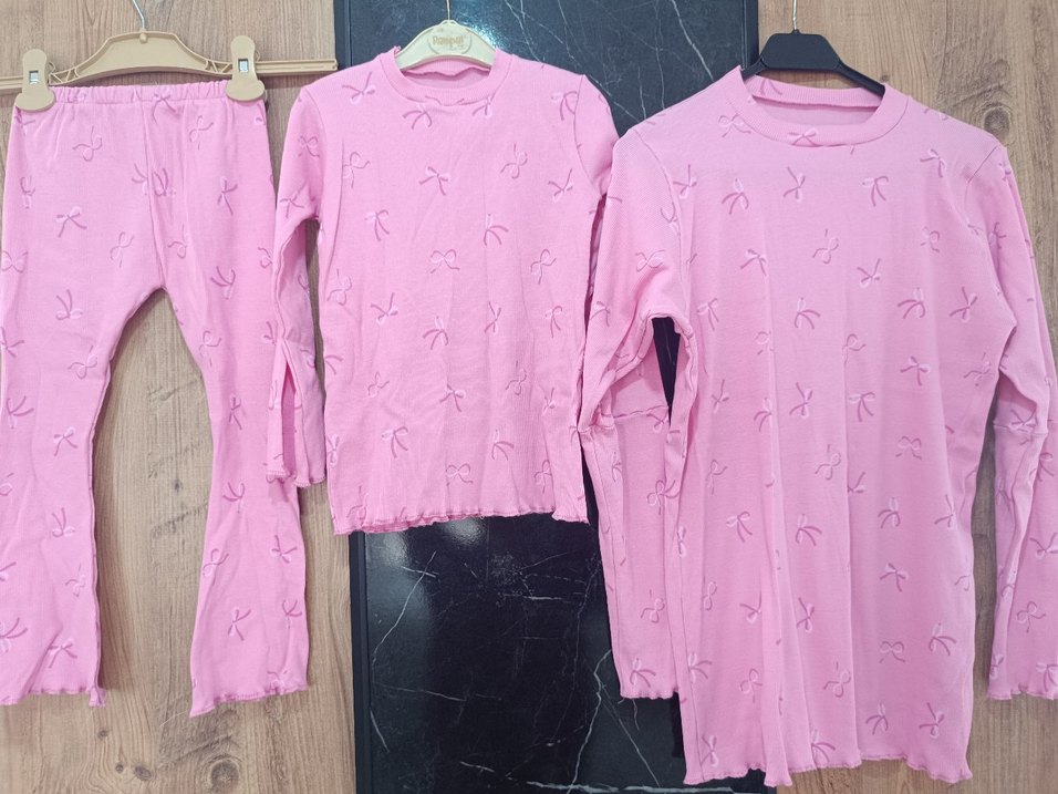 Pastel pembe renkte, uzun kollu ve bisiklet yaka kız çocuk takim. Yumuşak ve sıcak dokulu, triko kumaştan, baskılı fiyonk desenlidir. Rahat oturur.