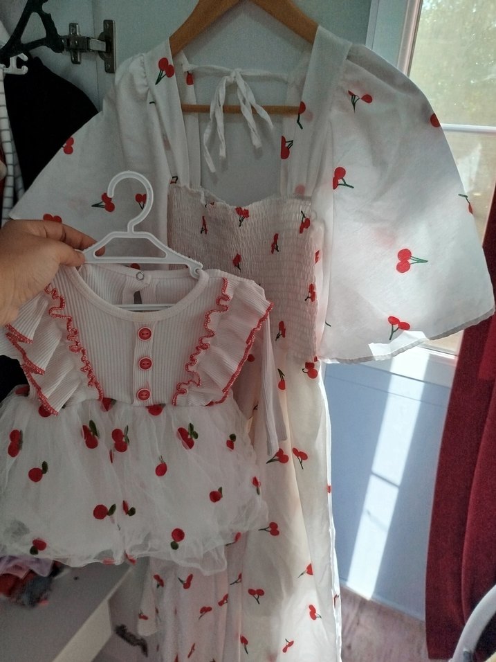 Beyaz, nakışlı kiraz desenli, kısa kollu, ve bol kesim midi boy elbise baytamda birkere giyildi çocuk için 6 8ay arası annede 100 kiloya kadar uygun