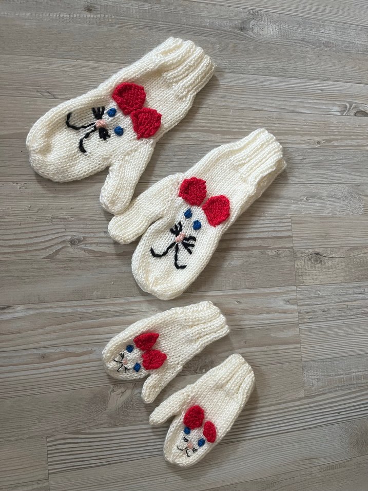 Kız çocukları için beyaz renkte, kırmızı fiyonk nakışlı örgü eldivenler. Klasik stilde ve yumuşak dokulu.