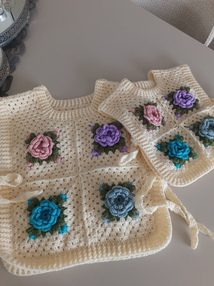 Bohem tarzda, bol kesim örgü kız hırkası. Pastel renklerde çok renkli nakışlı çiçek desenlerine sahiptir. Yumuşak ve rahat dokulu, detaylı örgü çiçek kareleri içerir. anne kız kombinlerinde dış çekim ve özel günlerde harika uyumlu bir parça istenile sadace çocuk olarakta örülebilir. el yapımıdır. fiyat sacede çocuk süveteri için geçerlidir.
