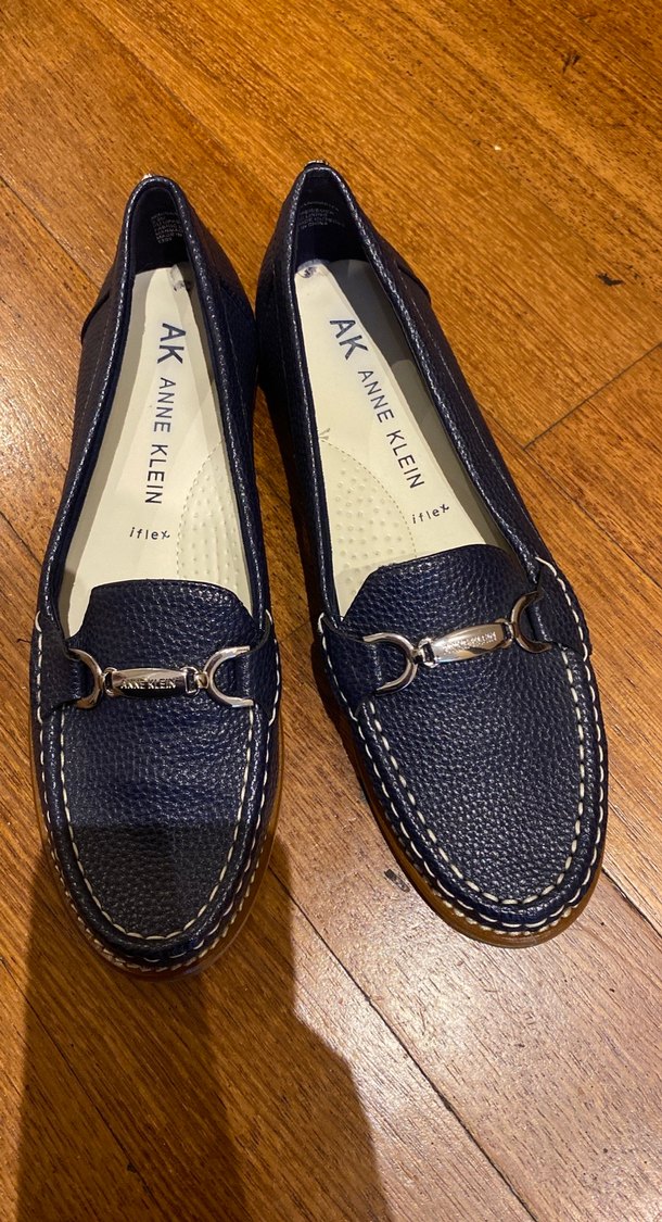 Anne Klein markalı lacivert deri kadın babet, dolgu topuklu ve tokalı tasarımıyla ofis için klasik şıklık sunar.