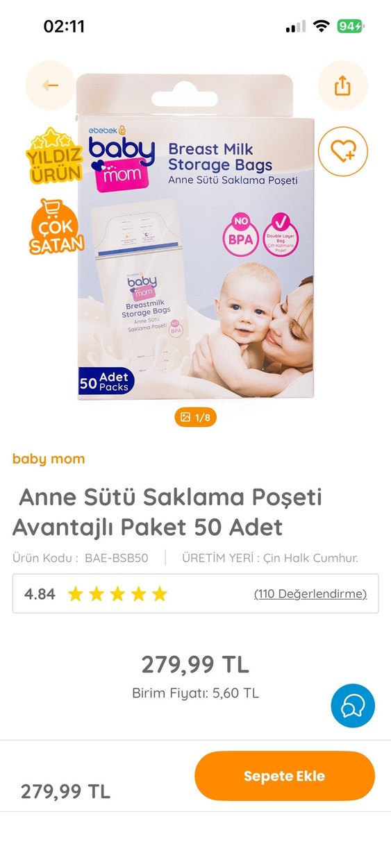 Baby Mom anne sütü saklama poşeti, BPA içermeyen malzeme ve çift katmanlı koruma ile 50 adet paket