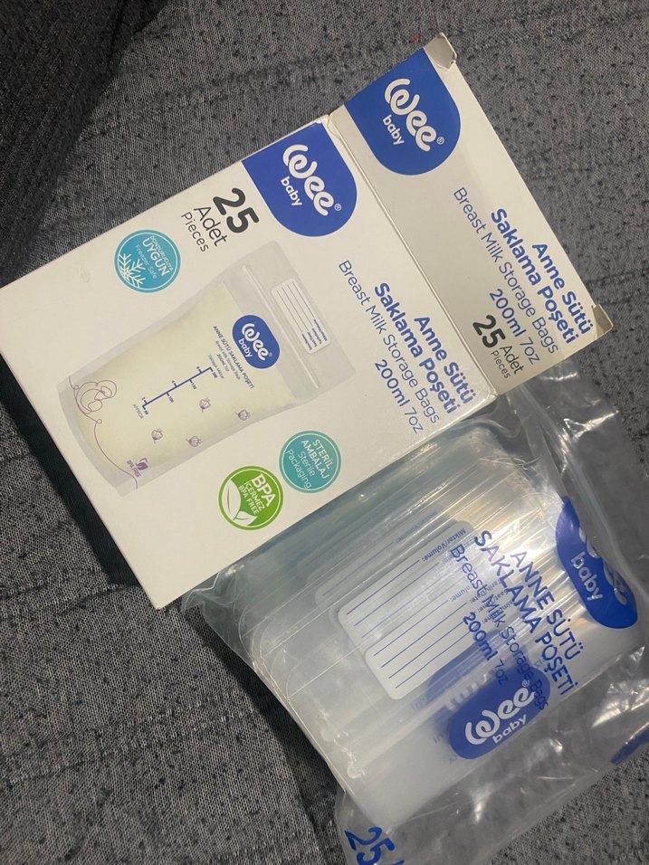 Wee Baby beyaz renkli, 200 ml kapasiteli anne sütü saklama poşetleri. 17 adet poşet içeren paket, güvenli ve hijyenik saklama sağlar.