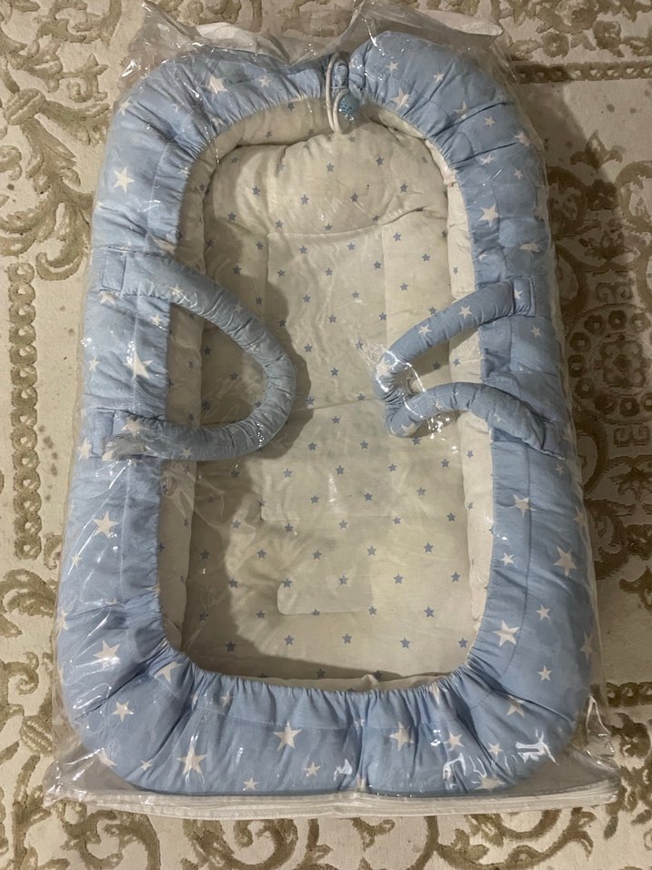 Sevi Bebe anne yanı reflü ve düz kafa yastıklı yatak. Pastel mavi renkte, yıldız desenli, yumuşak sentetik kumaştan yapılmış bebek uyku minderi. Bebekler için rahat bir dinlenme alanı sunar.