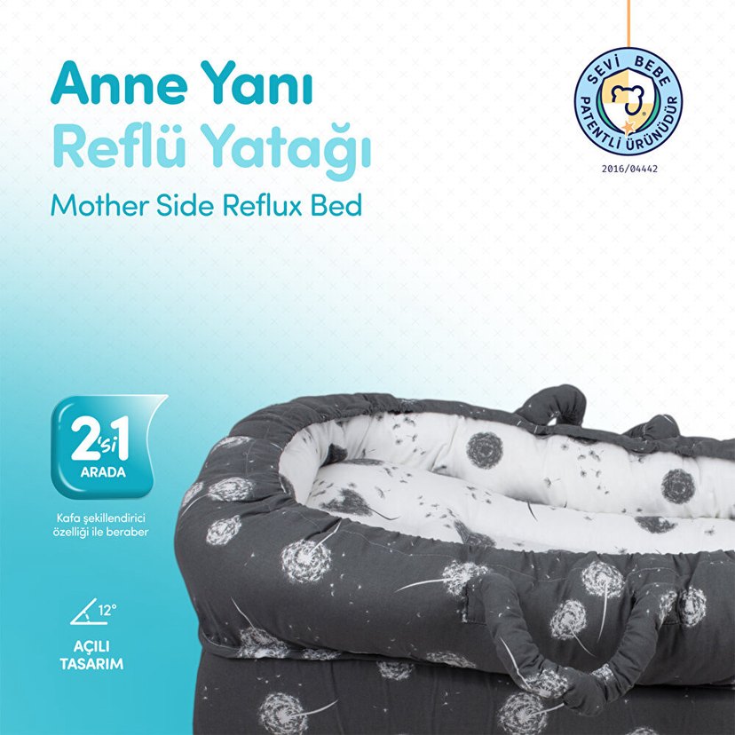 Doğum sonrası bazı bebeklerde yemek borusu kaslarının gelişme sürecine bağlı olarak reflü oluşabilir. Bu durumda eğimli reflü yatağı kullanılmalıdır. Kafa düzleşmesine karşı üründe kafa şekillendirici yastık bulunur. Yükseltilmiş yan kısım, bebeğin uyurken düşmesini engeller. Tutma kolları sayesinde rahat taşınır. Ergonomik iç yapısı bebeğin yan yatışını destekler. Ürünün içi nefes alır silikon boncuk elyaftan oluşurken, dış kumaşı %100 pamuktur. Alt kısmında yüksekliği sağlamak için poliüretan sünger kullanılmıştır. Reflü yatağının kılıfı makinede yıkanabilir. 0-6 ay arası kullanıma uygundur. Yatak Ölçüsü: 40 x 67 cm. Kullanılmadı. Bunun yerine eğim verilebilen anne yanı beşik kullandık.