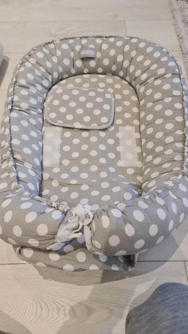 Gri renkte, beyaz puantiyeli yumuşak sentetik kumaştan yapılmış bebek yatağı ve küçük bir uyumlu yastık içerir. ️