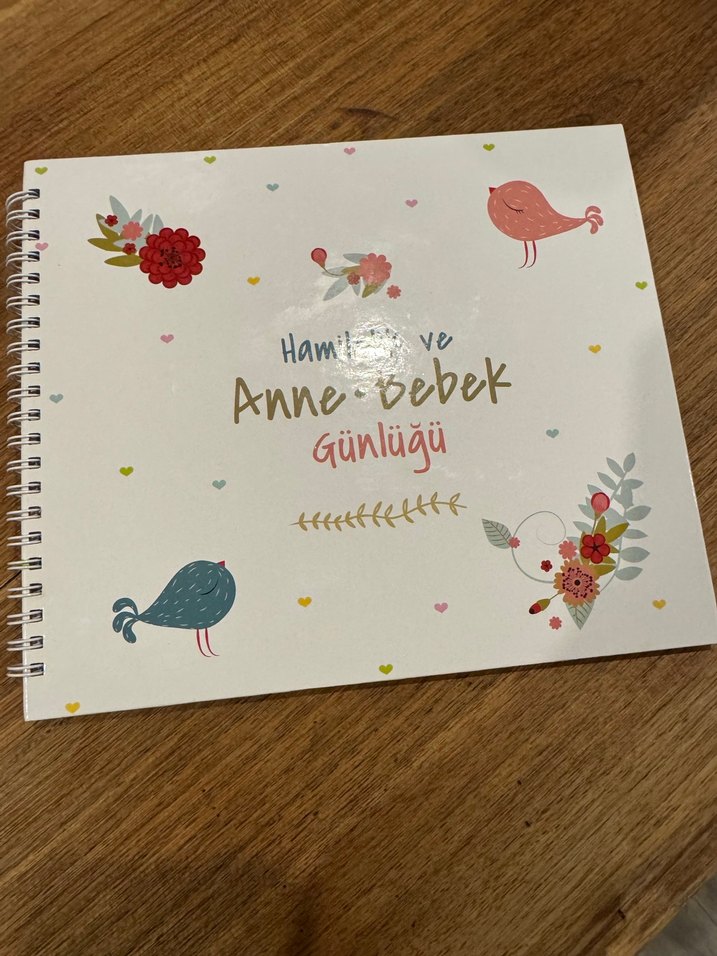 Çiçek ve kuş desenli, çok renkli kapaklı 'Hamilelik ve Anne Bebek Günlüğü' planlayıcı, hamilelik ve bebek takibi için uygun. Hiç kullanımadı