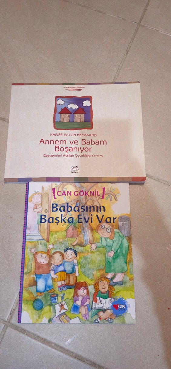 Boşanma sürecini çocuklara anlatan 'Annem ve Babam Boşanıyor' ve 'Babasının Başka Evi Var' kitapları. 2 adet kitap