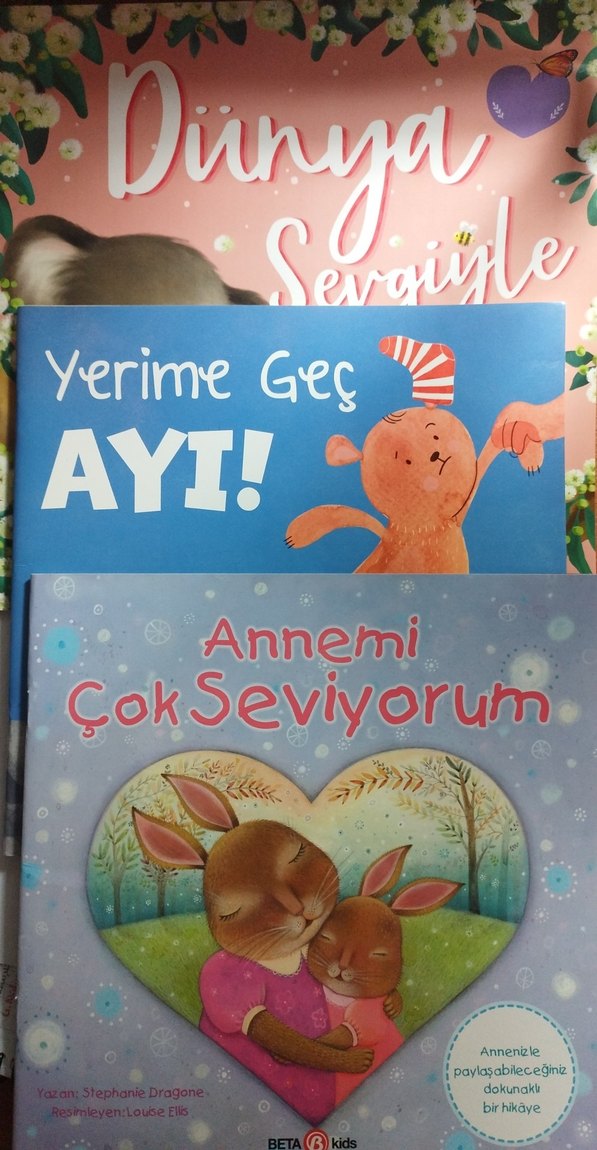 "Annemi Çok Seviyorum" , "Yerime Geç Ayı!" ,"Dünya Sevgoyle Güzel " adlı renkli çocuk kitapları, sevgi ve hayal gücünü anlatır. Beta ve İş Bankası Yayınları kitaplarıdır. Çok temiz ve hasarsızdır.