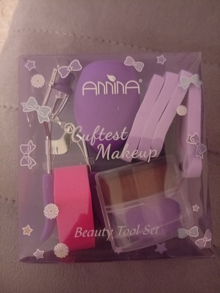 Annina markasının pastel mor renkli makyaj süngeri ve farklı uygulama araçları içeren makyaj seti.