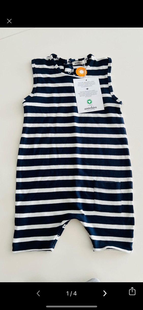 Lacivert ve beyaz çizgili, kolsuz bebek tulumu. Yuvarlak yaka ve ön cep detayı vardır. Yumuşak sentetik kumaştan yapılmıştır.
