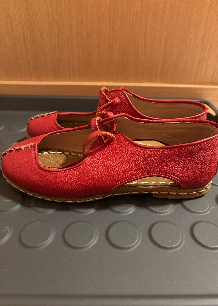 Gerçek deri, Antep işi bağcıklı kırmızı ayakkabı. Antep’den alınmıştır. 1-2 kez giyilmiştir herhangi bir defosu yoktur. 36 numara için uygundur