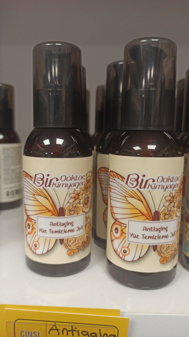 Doktor Kimyager markasının çiçek ve kelebek desenli etikete sahip anti-aging yüz temizleme jeli, cildi nazikçe temizleyip canlandırır.