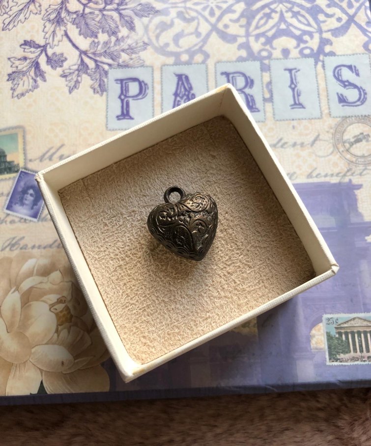 İşlemeli antik kalp charm. İki tarafında da işlemeler var. Metali nedir bilemiyorum. Rengi koyu bir renk, Kararmış bakıra benziyor, metali kararmış mı yoksa orijinali mi böyle bilemiyorum ama çok antik bir görünüşü var. Boyutu 1,5x2x1 cm. Madalyon gibi gözüküyor ama madalyon değil açılmıyor. Ucundaki takma yerinden takılara takılıp kullanılabilir. ✨Tüm ürünlerimi dürüst ve detaylı tarif ediyorum. İADE KABUL EDEMİYORUM, lütfen tüm sorularınızı satıştan önce sorunuz ✨Fotoğraflardaki kutular ve paketler görsel amaçlıdır, ürünle birlikte gönderilmez