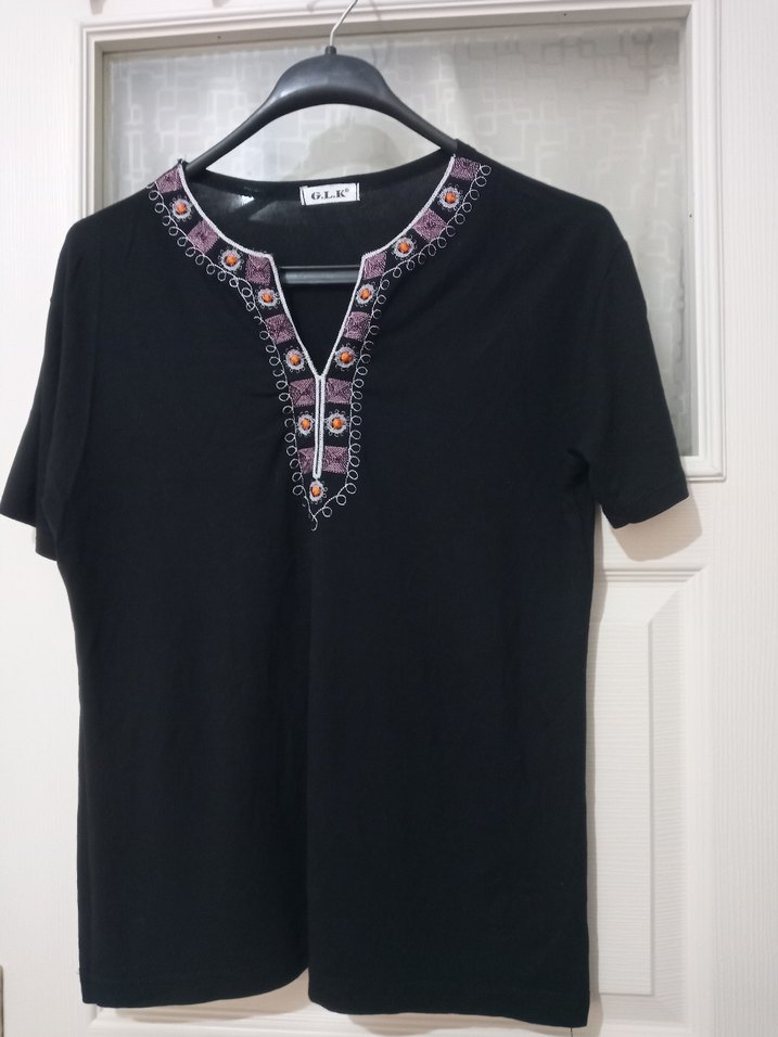 Antik,işlemeli,Siyah V Yaka Kadın kısakol tişört