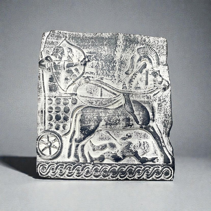 Bu eser, antik mitolojiyi yansıtan savaşçı ve at arabasının detaylı kabartmasını içerir. İnce işçilikle at, araba tekerlekleri ve savaşçı figürü öne çıkıyor. ölçüleri 20x18cmdir.Ürün 1.sınıf taş tozu ile hazırlanır.Arkasında asma aparatı mevcut.1adet fiyatıdır.