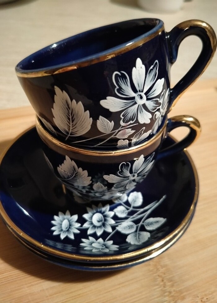 50 yılı aşkın vitrin ürünü. 2 adet fincan, 2 adet tabak. Sorunsuz. Lacivert renkli.