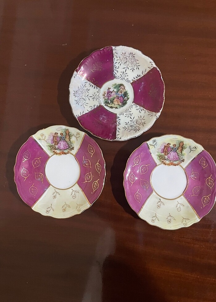 1 ADET FİYATI.. 2 si aynı desen, biri farklı Japan damga. diğerleri damgasız dönem , Frogonard desen çay tabağı fincan tabağı veya sunumluk. silintisi dışında sorunu yok. 3 ü 400 olur