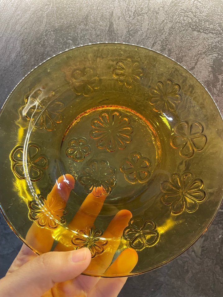 Parlak sarı renkte, kenarlarında çiçek desenleri bulunan cam tabak, şık bir sunum için idealdir. Antikadır. 6 adettir. Bir defa bile kullanılmamışlardır. Yenilerdir. Hiçbirinde kırık veya hasar yoktur.