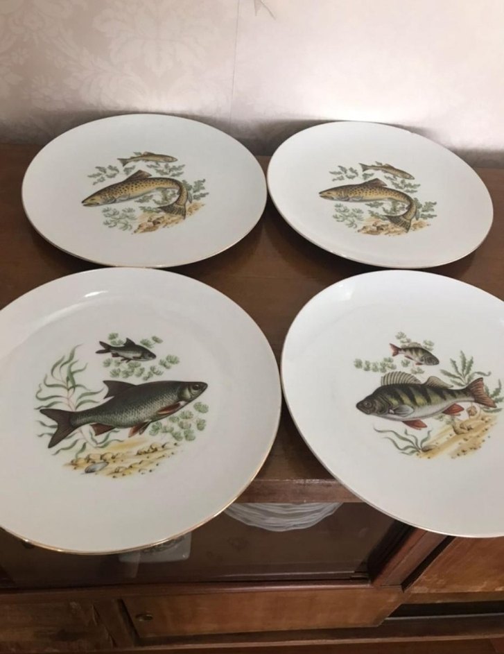 Antika Alman bavaria. Meşhur büyük boy Balık figürlü beyaz porselen tabaklar, doğal su bitkileri ile detaylandırılmış. Her tabakta farklı bir balık resmi bulunur. Bir tanesinde atık mevcut fotolar da belirttim.