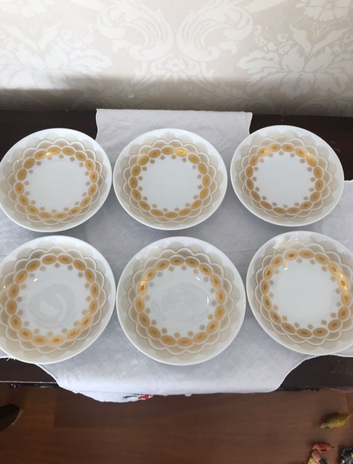 Antika Alman bavaria ak kasier el boyama incecik porselen lokumluk sunumluk. Altın halkalı desenli, beyaz altı parça tabak seti. Geleneksel tarzda, sade ve şık tasarıma sahiptir. ️