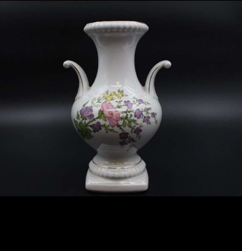 Antika Alman bavaria el boyama. Pastel çiçek desenleri ve zarif kıvrımlı kulplara sahip beyaz vazo, kare taban üzerinde şık bir görünüm sunar.