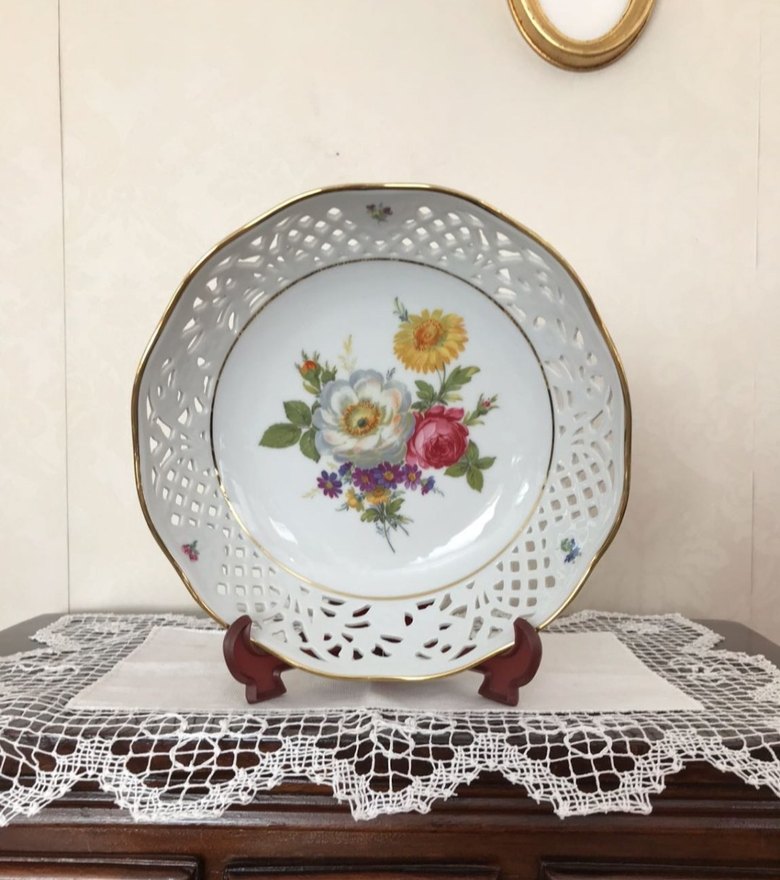 Antika Alman ajurlu el dekoru büyük Beyaz renkte, altın detaylı kenarları delikli, hafif renkli çiçek desenli dekoratif tabak. Sunum veya sergi için uygundur.