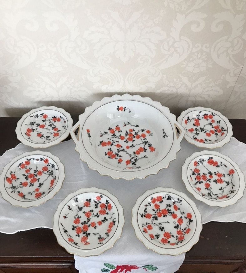 Antika Alman rosau el boyama incecik porselen lokumluk sunumluk. Canlı kırmızı ve siyah çiçek desenleriyle süslenmiş, beyaz porselenden yapılmış yedi parçalı servis seti. ️